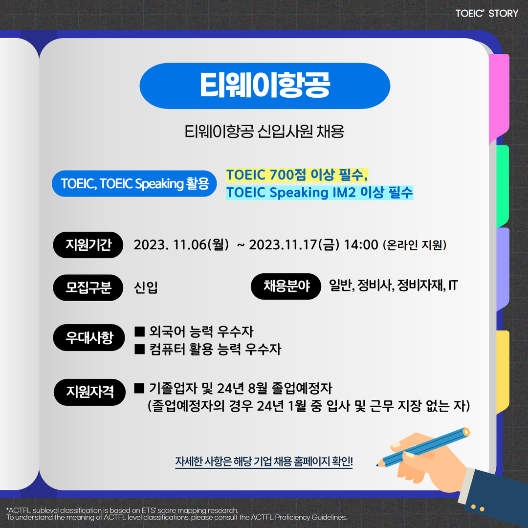 | 티웨이항공 | 신입 | 티웨이항공 신입사원 채용 | 11.17(금) 14:00 | TOEIC 700점 이상 필수, TOEIC Speaking IM2 이상 필수 |