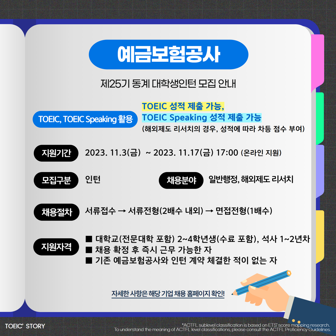 | 예금보험공사 | 인턴 | 예금보험공사 제25기 동계 대학생인턴 모집 안내 | 11.17(금) 17:00 | TOEIC 성적 제출 가능, TOEIC Speaking 성적 제출 가능 (취득한 성적에 따라 차등 점수 부여) |