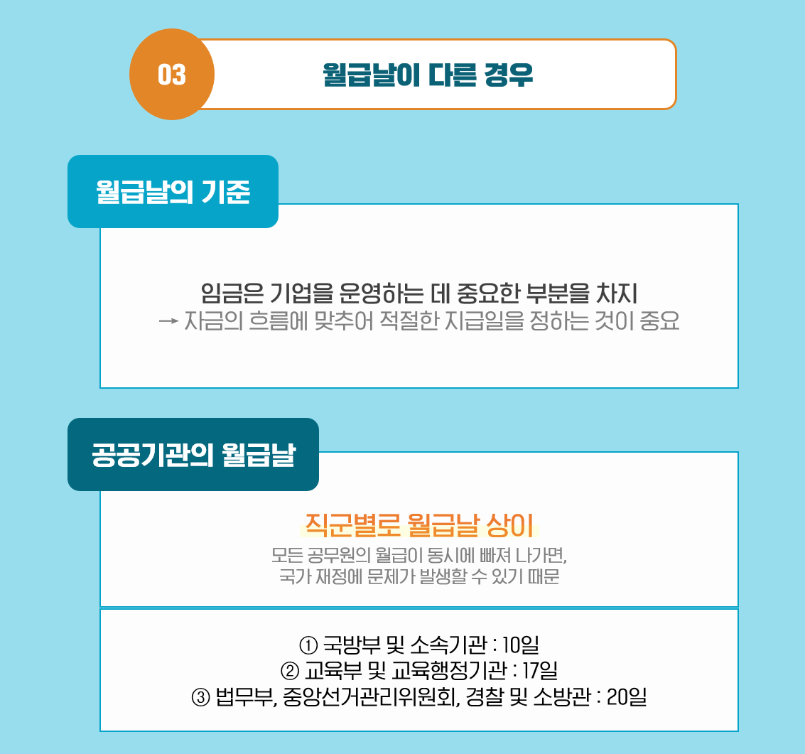 다만, 공공기관에서 일하는 공무원의 경우 일반 회사원과 달리 직군별로 월급날이 상이한데요. 그 이유는 모든 공무원의 월급이 일시에 빠져나가면, 국가 재정에 문제가 발생할 수 있기 때문에 이를 방지하기 위해 직군별로 날짜를 달리하게 되었습니다.