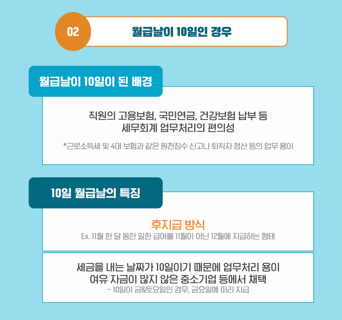 이는 다양한 이유가 있을 수 있지, 직원의 고용보험, 국민연금, 건강보험 등 세금을 내는 날짜가 10일이기 때문에 세무회계 업무처리의 편의를 위해 10일로 지정하는 경우 있습니다.
