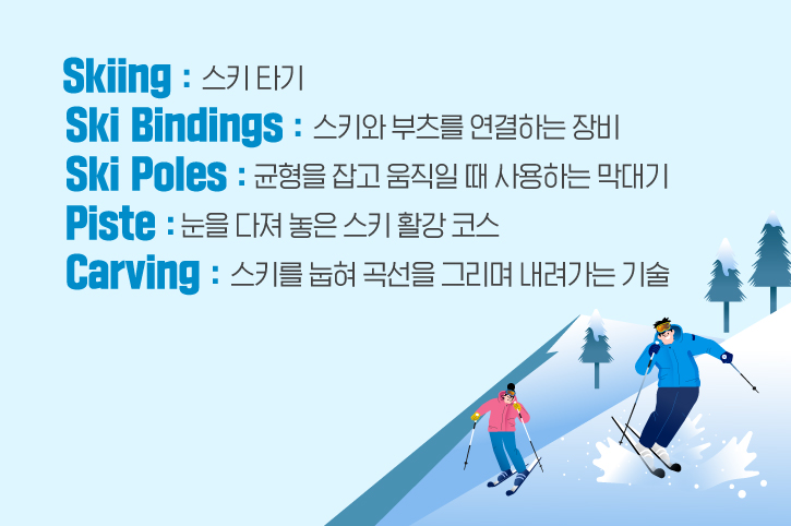 스키장에 입장했다면, 이제는 스키를 즐길 시간인데요. 스키를 타는 것은 영어로‘Skiing(스키 타기)’이라고 표현합니다. 스키와 스키화를 연결하는 장비는 ‘Ski Bindings’라고 하는데요. 여기서 ‘Binding’의 원형인 ‘Bind’는 ‘묶다’, ‘감다’라는 뜻을 갖고 있습니다. 또, 스키를 탈 때 빼놓을 수 없는 장비인 ‘Ski Poles’도 있는데요. ‘폴대’라고도 불리는 Ski Poles는 균형을 잡아주고 더 역동적인 스키를 즐기는 데 도움을 주곤 하죠!