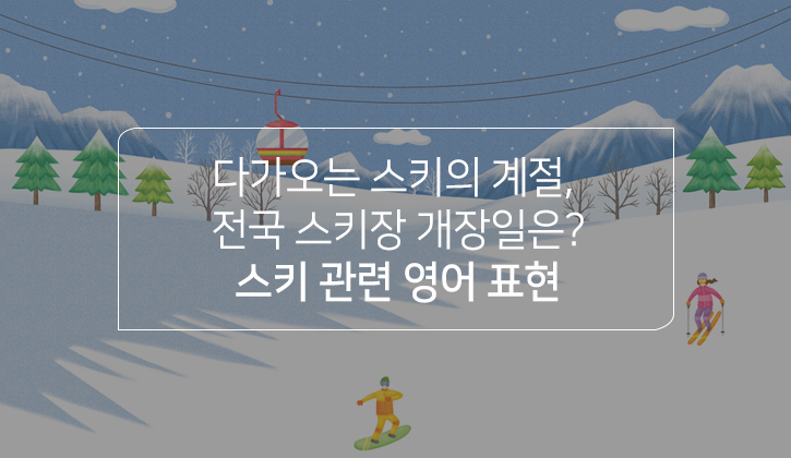 전국의 스키장 개장이 눈앞으로 다가왔습니다! 이미 몇 군데는 문을 연 곳도 있고, 다른 곳도 속속히 스키 시즌을 준비하고 있는데요. 많은 사람들이 겨울에는 하얀 눈으로 뒤덮인 스키장에서 스키, 보드, 썰매를 타면서 에너지를 방출하곤 하죠. 이에, 오늘 <토익스토리>에서는 국내 스키장 개장을 맞이하여 스키와 관련된 영어 표현을 준비했습니다. 함께 살펴보시죠! :)