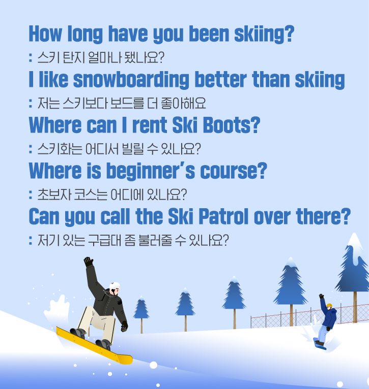 마지막으로, 스키장에서 자주 사용하는 영어 표현에 대해 소개해드리겠습니다. 먼저, 상대의 스키 경험이 궁금할 땐, “How long have you been skiing?”이라고 물어보면 되는데요. 혹시 스키보다 보드를 타는 것을 더 즐긴다면, “I like snowboarding better than skiing”이라고 얘기할 수 있습니다. 또, 스키화를 빌리고 싶은데 렌탈샵이 어딨는지 모를 때는 “Where can I rent Ski Boots?”라고 물어보세요!