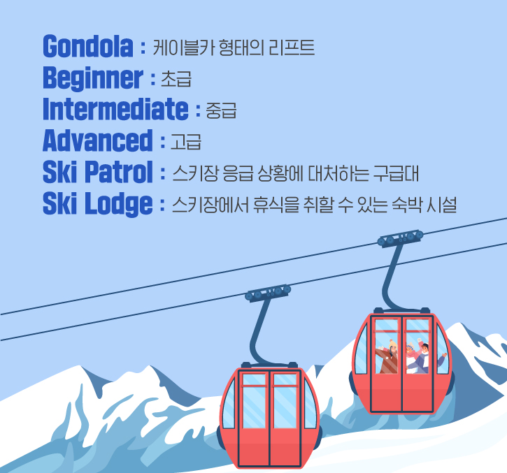 스키를 더 알차게 즐기기 위해서는 스키장의 시설을 이용하는 경우가 많은데요. 먼저, 활강 코스까지 짧고 편리하게 올라가기 위해 만들어진 케이블카 형태의 스키 리프트를 ‘Gondola’라고 합니다. 우리가 익히 알고 있는 곤돌라는 ‘흔들리다’라는 뜻의 이탈리아어에서 유래됐으며, 이탈리아 베네치아 시내에 있는 운하를 운항하는 배, 이삿짐을 나르는 운반기, 스키장의 리프트를 모두 ‘곤돌라’라고 표현하죠. 또한, 스키장에는 여러 수준의 활강 코스가 존재하는데요. 초급은 ‘Beginner’, 중급은 ‘Intermediate’, ‘고급은 ‘Advanced’라고 말할 수 있습니다.