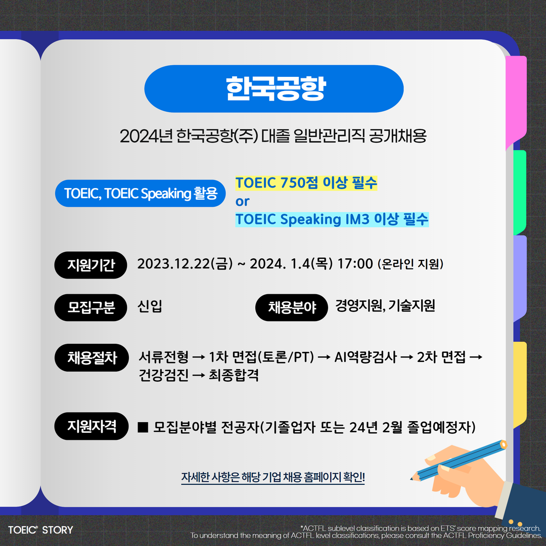 | 한국공항 | 신입 | 2024년 한국공항 대졸 일반관리직 공개채용 | 1.4(목) 17:00 | TOEIC 750점 이상 필수 or TOEIC Speaking IM3 이상 필수 |