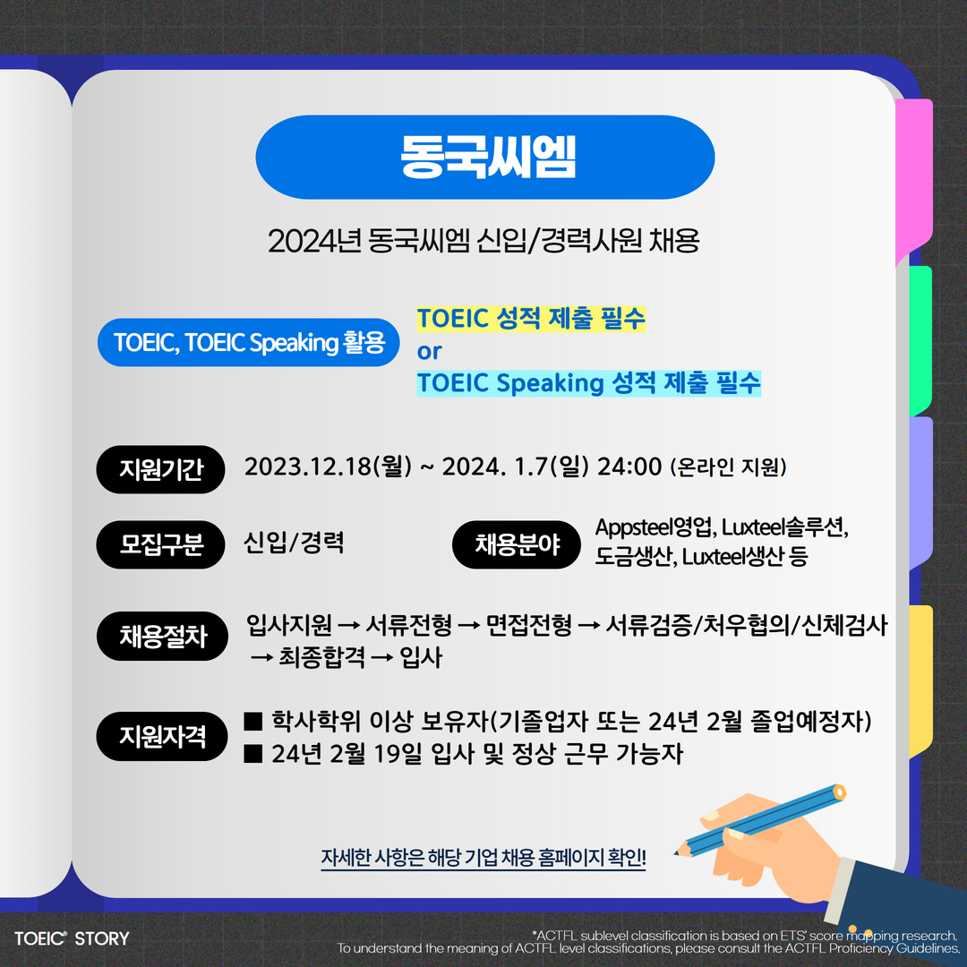 | 동국씨엠 | 신입/경력 | 2024년 신입/경력사원 채용 | 1.7(일) 24:00 | TOEIC 성적 제출 필수 or TOEIC Speaking 성적 제출 필수 |