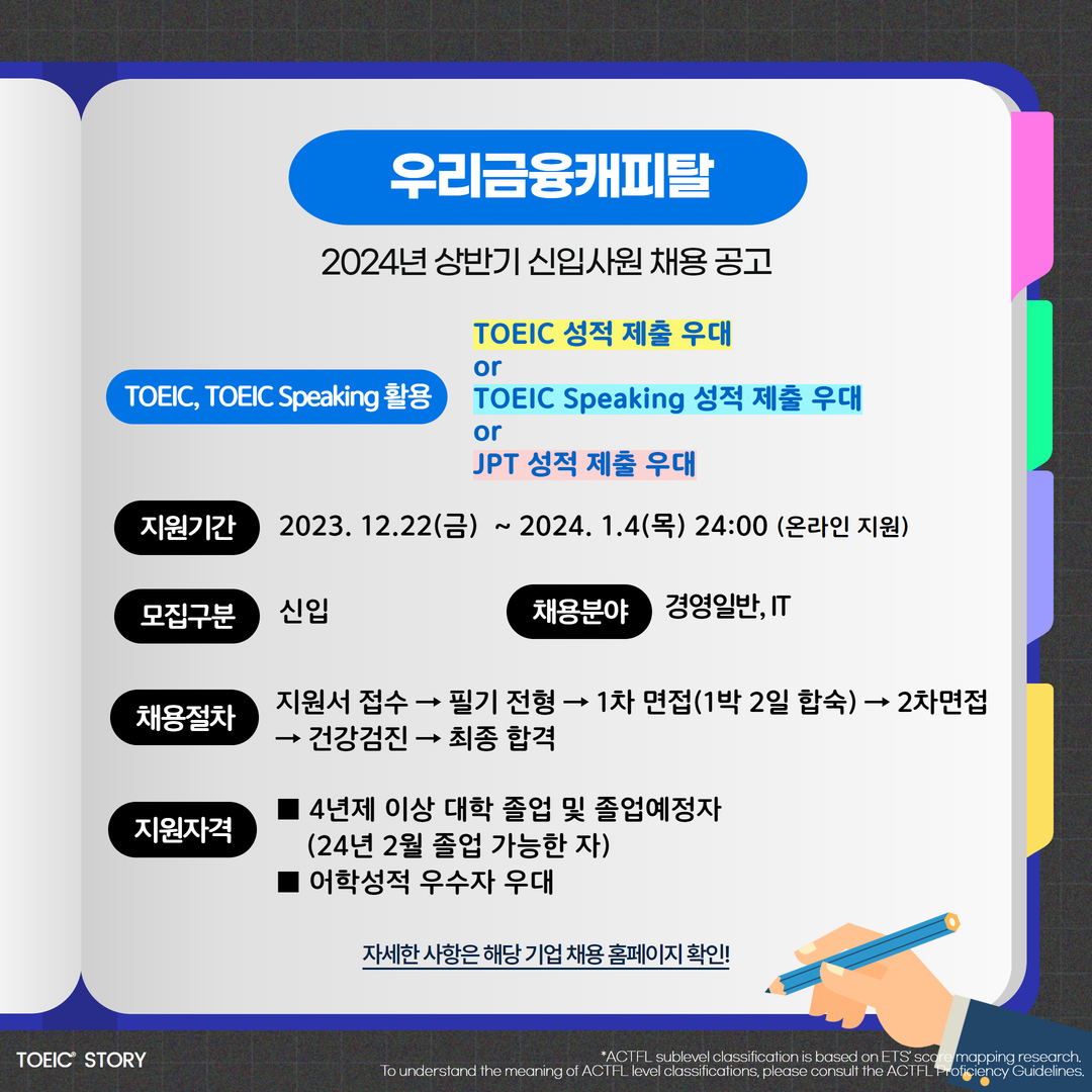 | 우리금융캐피탈 | 신입 | 2024년 상반기 신입사원 채용 | 1.4(목) 24:00 | TOEIC 성적 제출 우대 or TOEIC Speaking 성적 제출 우대 or JPT 성적 제출 우대 |