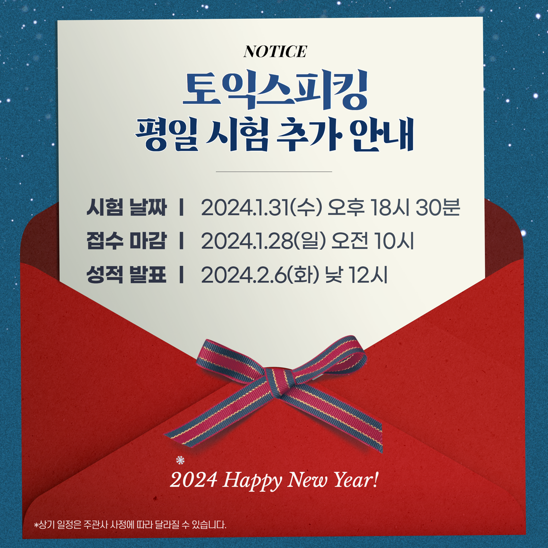 2024년 새해 처음으로 추가되는 토익스피킹 평일 시험은 2024년 1월 17일(수) 오후 18시 30분에 시행됩니다.