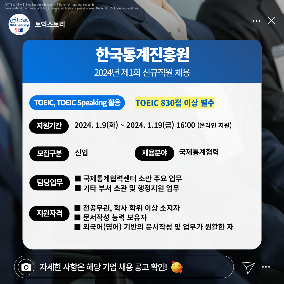 | 한국통계진흥원 | 신입 | 2024년 제1회 신규직원 채용 | 1.19(금) 16:00 | TOEIC 830점 이상 필수 |