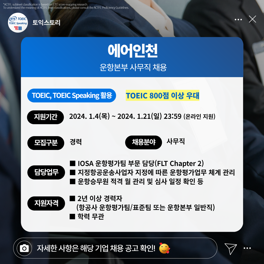| 에어인천 | 경력 | 에어인천(주) 운항본부 사무직 채용 | 1.21(일) 23:59 | TOEIC 800점 이상 우대 |