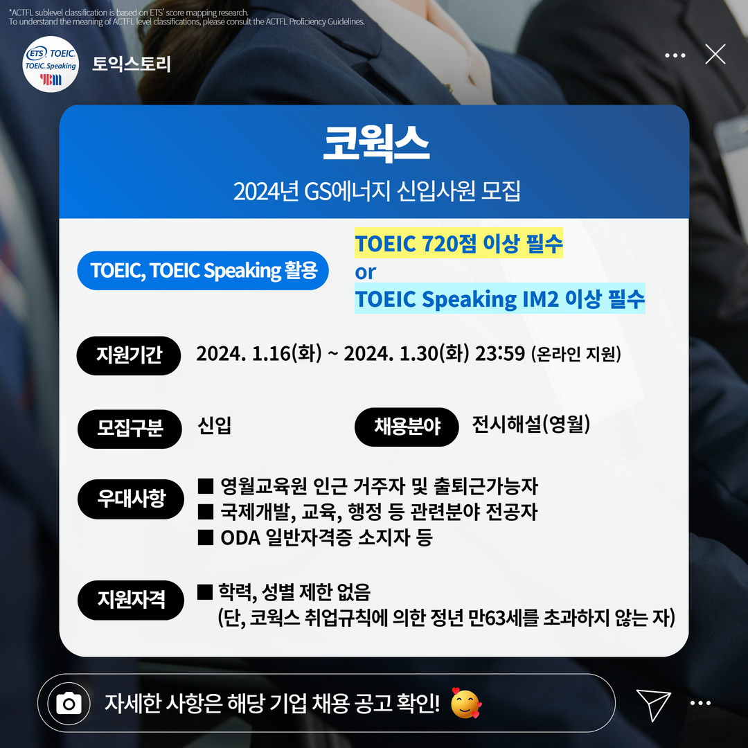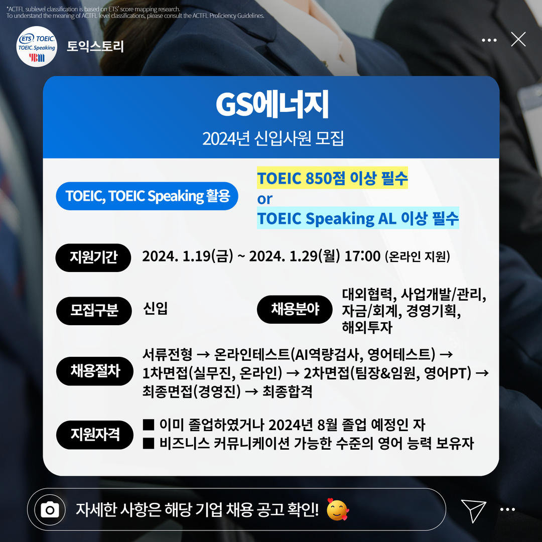 | GS에너지 | 신입 | 2024년 GS에너지 신입사원 모집 | 1.29(월) 17:00 | TOEIC 850점 이상 필수 or TOEIC Speaking AL 이상 필수 |