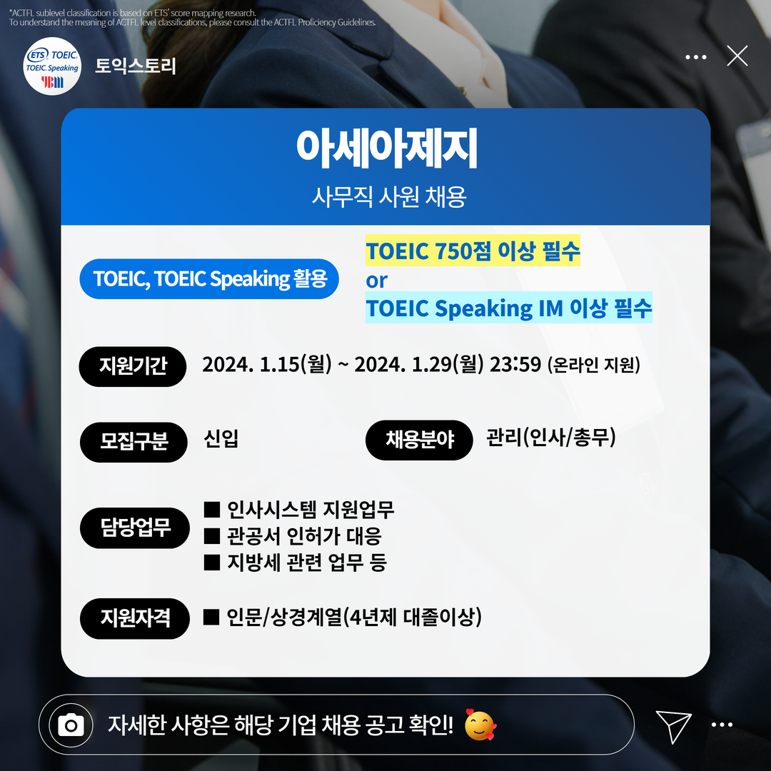 | 아세아제지 | 신입 | 아세아제지 관리(인사/총무) 채용 | 1.29(월) 23:59 | TOEIC 750점 이상 필수 or TOEIC Speaking IM 이상 필수 |