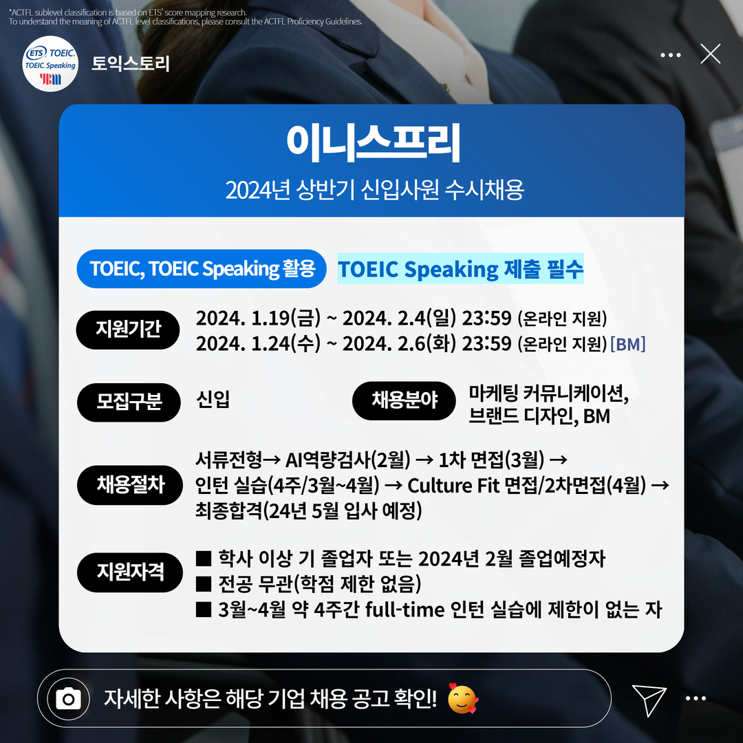 공통 지원자격은 학사 이상 기 졸업자 또는 2024년 2월 졸업예정자입니다. 모든 지원자는 유효한 토익스피킹 성적을 제출해야 합니다. :)