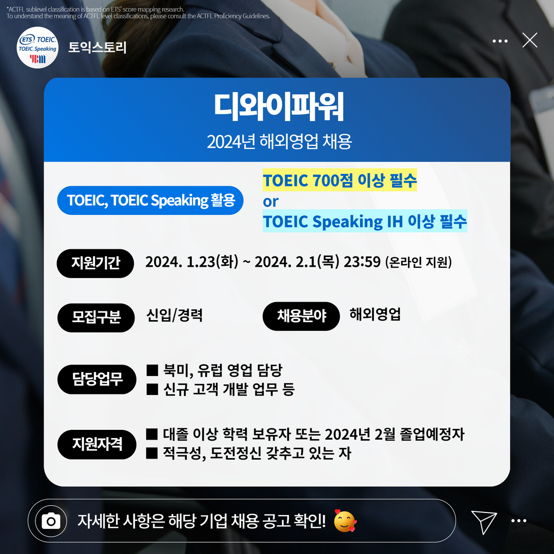 | 디와이파워 | 신입/경력 | 2024년 해외영업 채용 | 2.1(목) 23:59 | TOEIC 700점 이상 필수 or TOEIC Speaking IH 이상 필수 |