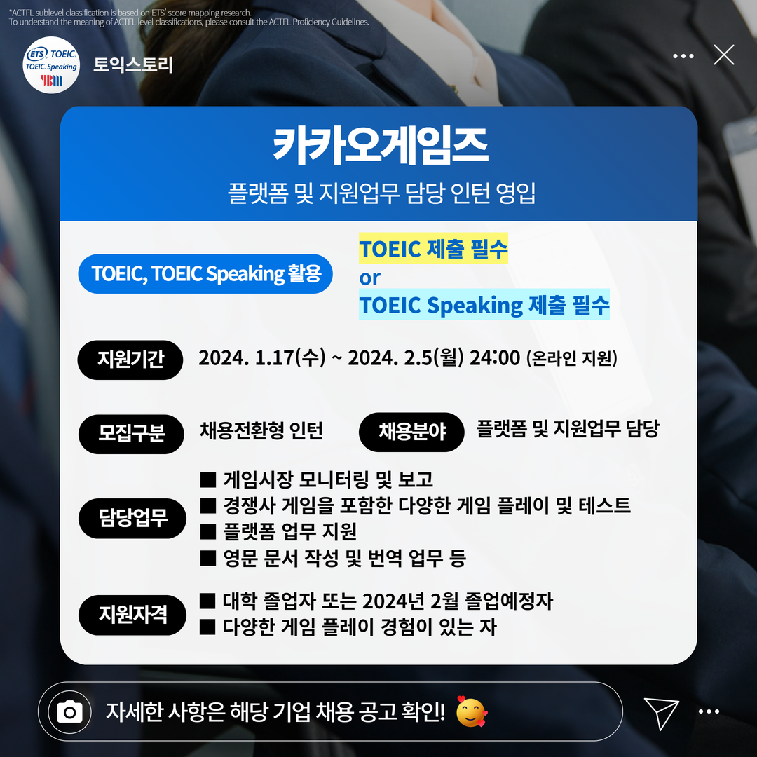 | 카카오게임즈 | 인턴 | 플랫폼 및 지원업무 담당 인턴 영입 | 2.5(월) 24:00 | TOEIC 성적 제출 필수 or TOEIC Speaking 성적 제출 필수 |
