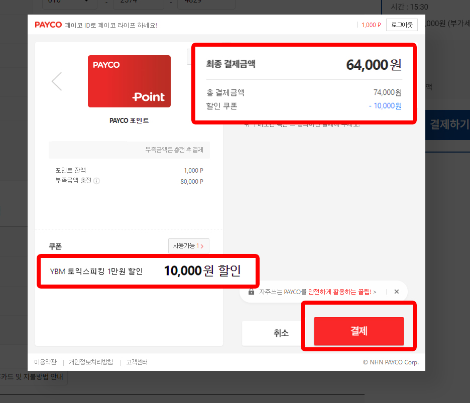 STEP 5. PAYCO로 결제 시, 자동으로 10,000원이 더 할인됩니다. 최종 결제금액 64,000원으로 결제해 주세요! 짝짝짝 :D