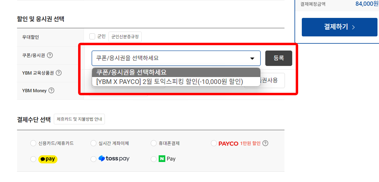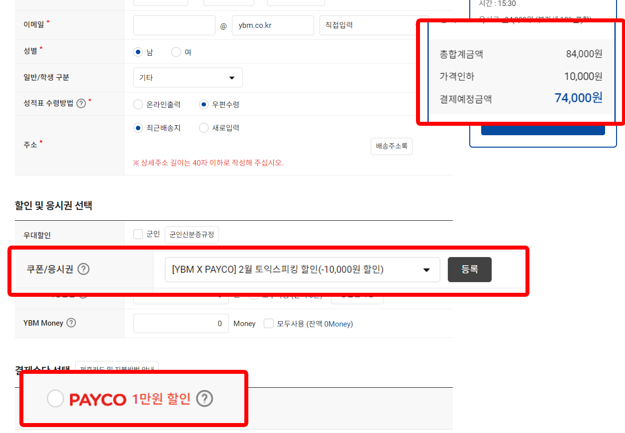 접수 페이지에서 '할인 및 응시권 선택' -> 'YBM X PAYCO 쿠폰 클릭 및 적용'
