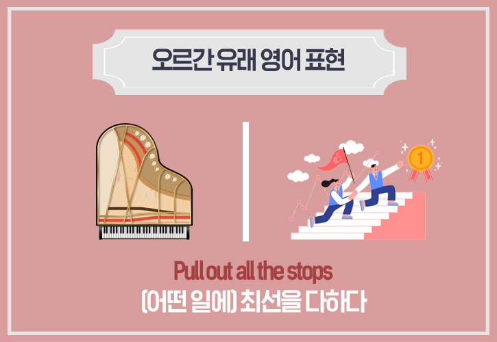 Pull out all the stops’는 가능한 모든 수단을 동원하여 노력하거나, 어떤 일에 최선을 다한다는 뜻을 갖고 있습니다. 이 표현은 오르간 연주에서 유래되었는데요. 오르간의 ‘Stops(스톱)’은 다른 음색들을 얻기 위한 장치로, 스톱을 다 당기면 최대의 웅장한 음색을 낼 수 있습니다.