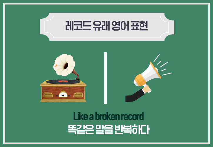 ‘Like a broken record’는 같은 말 혹은 주제를 반복적으로 얘기할 때 사용됩니다. 이 표현은 오래전 사용되던 레코드 기계에서 유래됐는데요. 예전에는 음악을 듣기 위해서 레코드 기계를 이용해야 했고, 각 트랙을 재생하려면 레코드를 일정한 속도로 회전시켜야 했죠. 때때로 레코드에 손상이 생기면 같은 부분만을 반복했기 때문에, 똑같은 소리가 계속해서 들리곤 했습니다.
