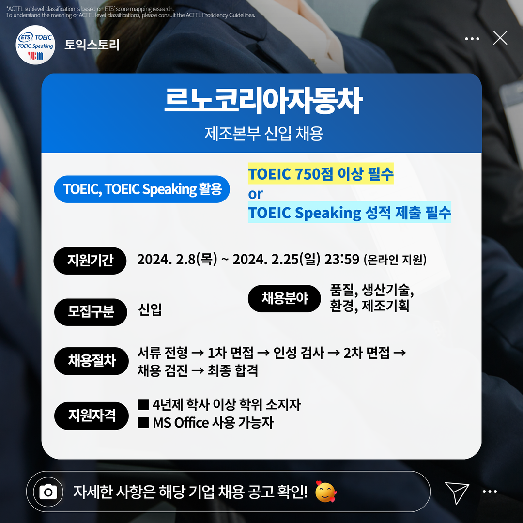 르노코리아자동차 신입 제조본부 신입 채용 2.25(일) 23:59 TOEIC 750점 이상 필수,