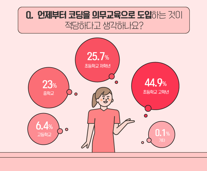 설문 참여자들은 언제부터 코딩 의무교육은 받는 것이 적당하다고 생각할까요? ‘초등학교 고학년’이 44.9%로 가장 높았고, ‘초등학교 저학년(25.7%)’, ‘중학교(23%)’ 순으로 나타났습니다. 그 외, ‘고등학교(6.4%)’, ‘기타(0.1%)’가 뒤를 이었습니다.
