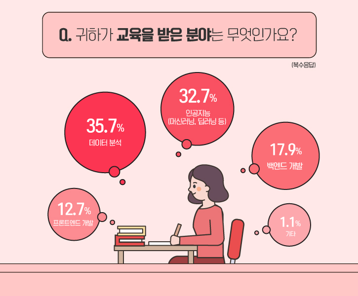 그 외, ‘백엔드 개발(17.9%)’, ‘프론트엔드 개발(12.7%)’, ‘기타(1.1%)’ 순의 응답이 뒤를 이었습니다.