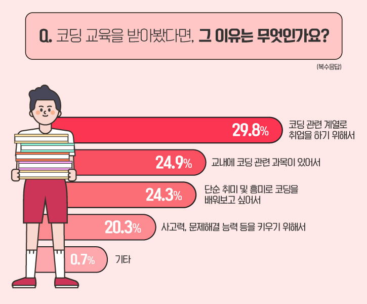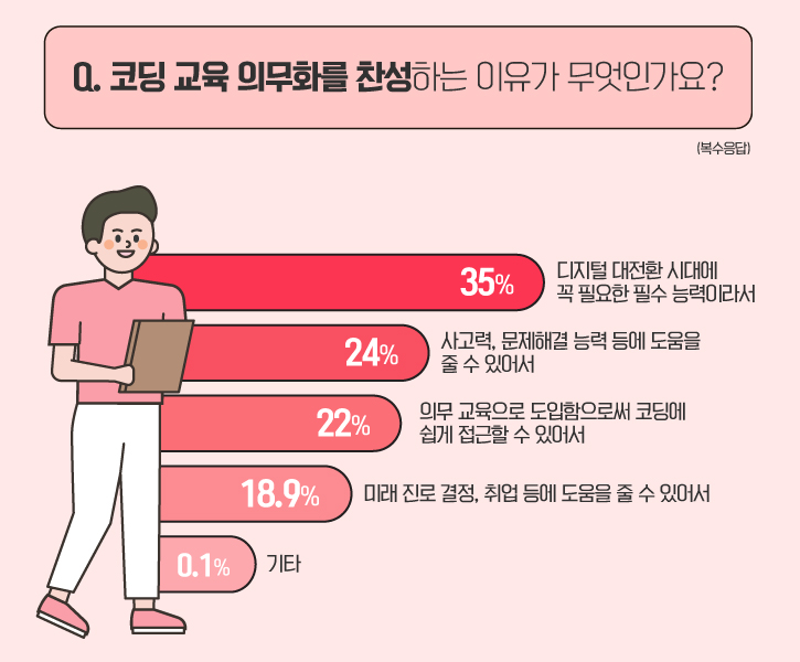 뒤를 이어, ‘사고력, 문제해결 능력 등에 도움을 줄 수 있어서(24%)’, ‘의무 교육으로 도입함으로써 코딩에 쉽게 접근할 수 있어서(22%)’, ‘미래 진로 결정, 취업 등에 도움을 줄 수 있어서(18.9%)', ‘기타(0.1%)’ 순으로 나타났네요!
