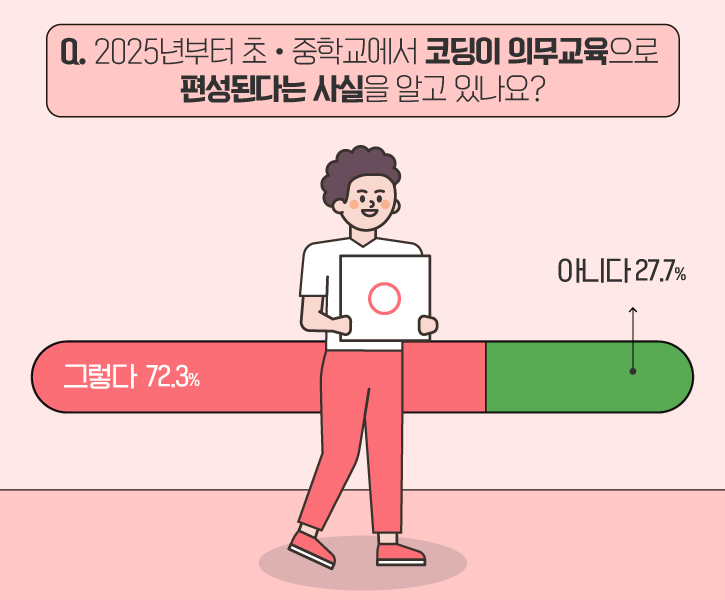 추가로, 설문 참여자들에게 2025년부터 초•중학교에서 코딩이 의무교육으로 편성된다는 사실을 알고 있는지 물었는데요. 전체 설문 참여자의 72.3%가 '그렇다'고 답했습니다. 이 결과를 통해 코딩 교육의 의무화가 대중들에게도 중요한 이슈라는 것을 짐작해 볼 수 있었습니다.