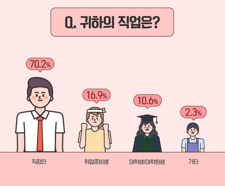 먼저, 설문 참여자의 직업별 비율을 살펴보겠습니다. 이번 설문조사는 ‘직장인’이 70.2%로 압도적인 비율을 보였는데요. ‘취업준비생’과 ‘대학생/대학원생’이 각각 16.9%와 10.6%, ‘기타(2.3%)’ 순으로 뒤를 이었습니다.