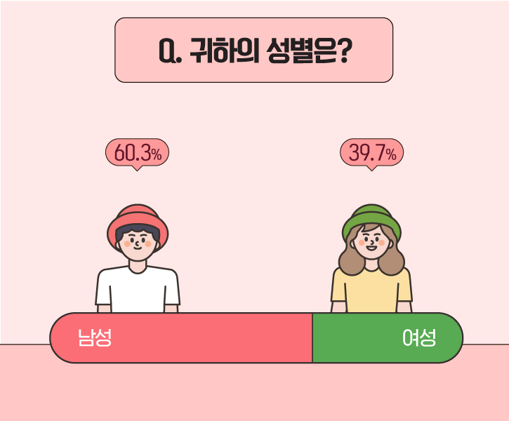 설문 참여자의 성비는 ‘남성’이 60.3%, ‘여성’이 39.7%로 남성 참여자의 비율이 더 높게 나타났네요!