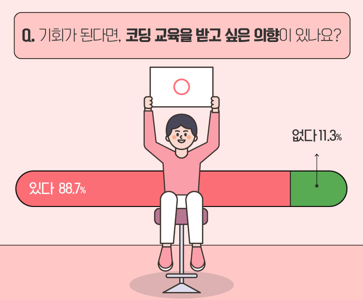 만약 코딩 교육의 기회가 제공된다면, 설문 참여자들은 코딩 교육을 받고 싶은 의향이 있을까요? 이에 대한 답변으로는 88.7%의 높은 비율로 코딩 교육 수강에 대한 긍정적인 반응을 보였습니다.