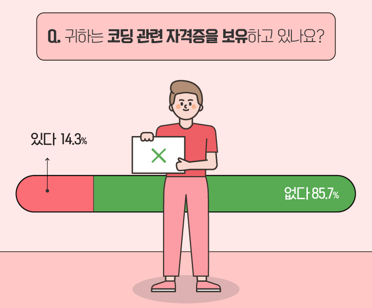 그렇다면 설문 참여자 중 ‘코딩 자격증’을 보유하고 있는 분들은 얼마나 될까요? ‘코딩 교육 경험’에 대한 긍정 응답은 46.9%로 높게 나온 데에 반해, ‘자격증이 있다’고 답한 이는 14.3%의 다소 낮은 비율을 보였습니다.