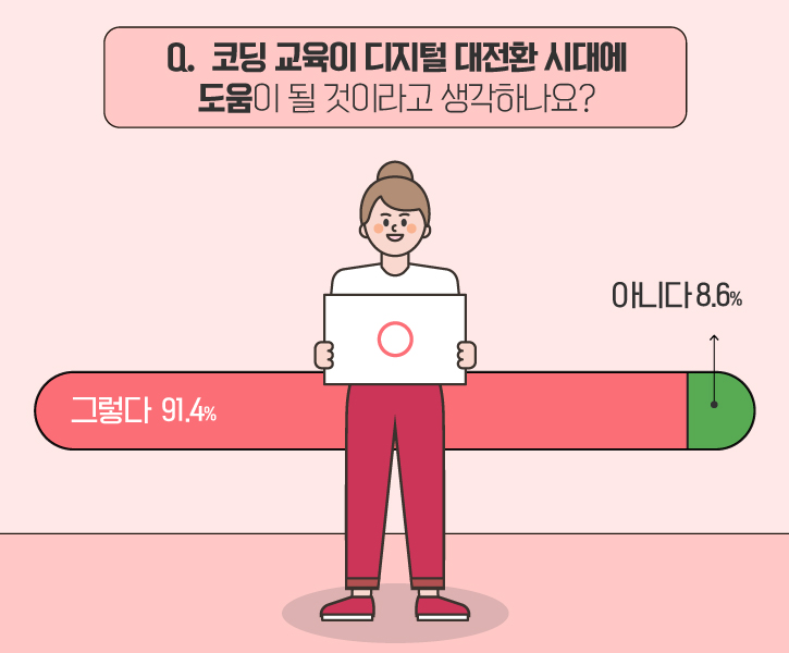 마지막으로, ‘코딩 교육이 디지털 대전환 시대에 도움이 될 것인지 묻는 질문에는 '그렇다'라는 답변이 91.4%로 압도적인 비율을 기록했습니다! :)