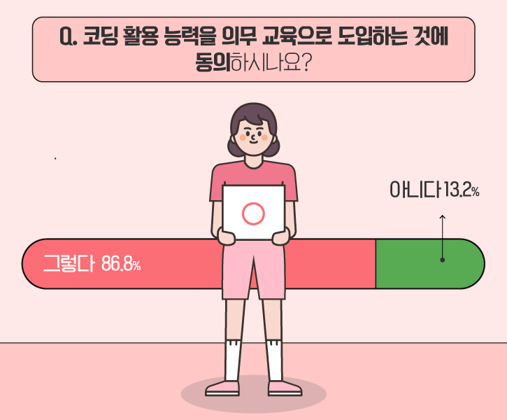 또한, 86.8%의 높은 비율로 설문 참여자 대다수가 코딩 활용 능력을 의무 교육으로 도입하는 것에 동의했는데요. 이는 설문 참여자들의 경험에 비추어 봤을 때, 코딩 교육이 실제로 학업과 진로에 도움이 된다고 생각하기 때문인 것으로 보입니다.