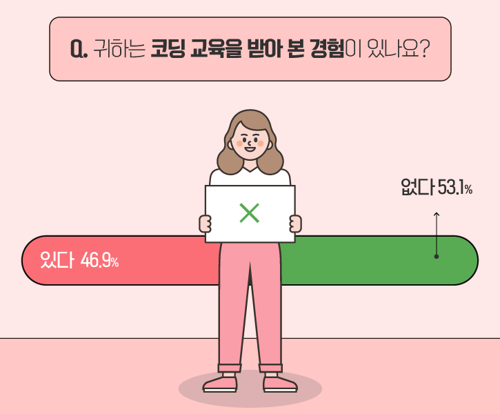 본격적인 첫 질문으로, ‘코딩 교육의 경험 여부’를 물었습니다. 설문 참여자 중 무려 46.9%가 ‘코딩 교육을 받아본 적이 있다’고 답했는데요.