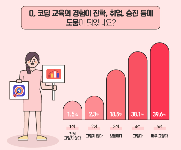 '보통이다'라는 응답도 18.5%로 나타났습니다. 이를 모두 합치면 총 96.2%로 코딩 교육을 받은 거의 대부분의 사람들이 코딩 교육이 진로나 취업 등에 도움이 된다고 답했네요!