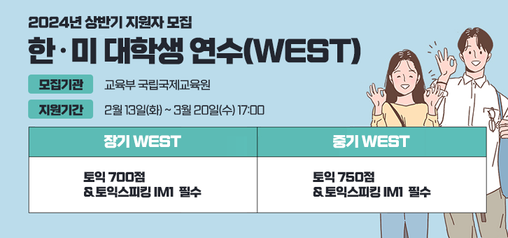 2023년 하반기 WEST 프로그램 선발 과정이 끝났습니다. WEST는 한미 대학생 연수로, 어학연수와 인턴십을 동시에 진행할 수 있는 프로그램이죠. 많은 분이 목표로 하는 꿈을 이루기 위해 해당 프로