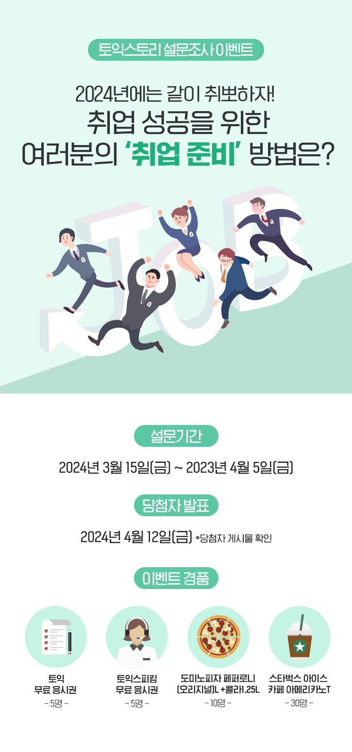 | [당첨자 발표] 2024년에는 취뽀하자! 취업 성공을 위한 여러분의 ‘취업 준비’ 과정은? (0) | 2024.04.12 |