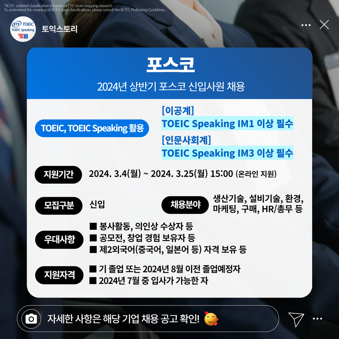 | 포스코 | 신입 | 2024년 상반기 포스코 신입사원 채용 | 3.25(월) 15:00 | [이공계] TOEIC Speaking IM1 이상 필수 [인문사회계] TOEIC Speaking IM3 이상 필수 |