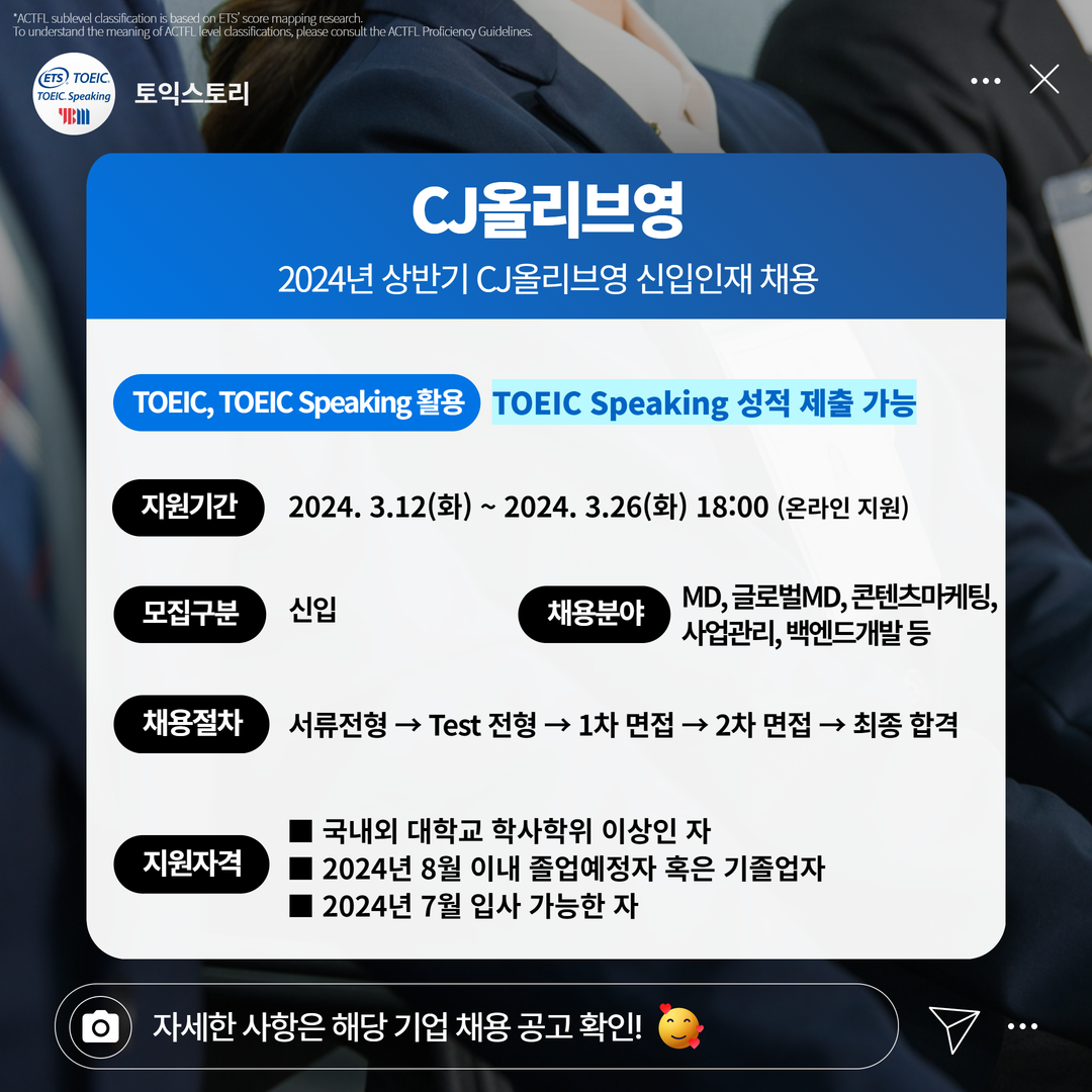 | CJ올리브영 | 신입 | 2024년 상반기 CJ올리브영 신입인재 채용 | 3.26(화) 18:00 | TOEIC Speaking 성적 제출 가능 |