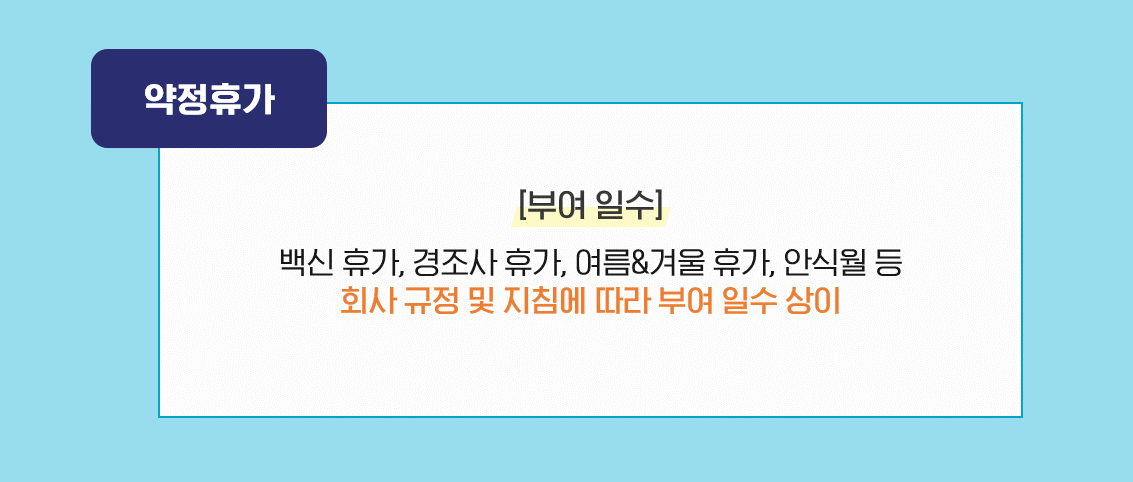 ‘약정휴가’는 회사 규정 및 지침에 따라 상이하기 때문에, 부여 일수 또한 회사마다 다르게 나타납니다!