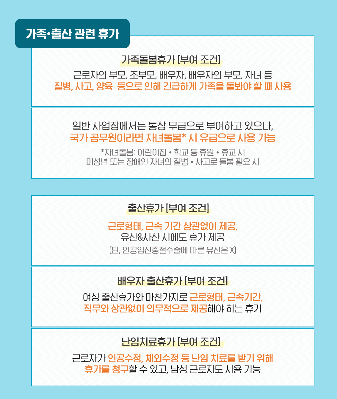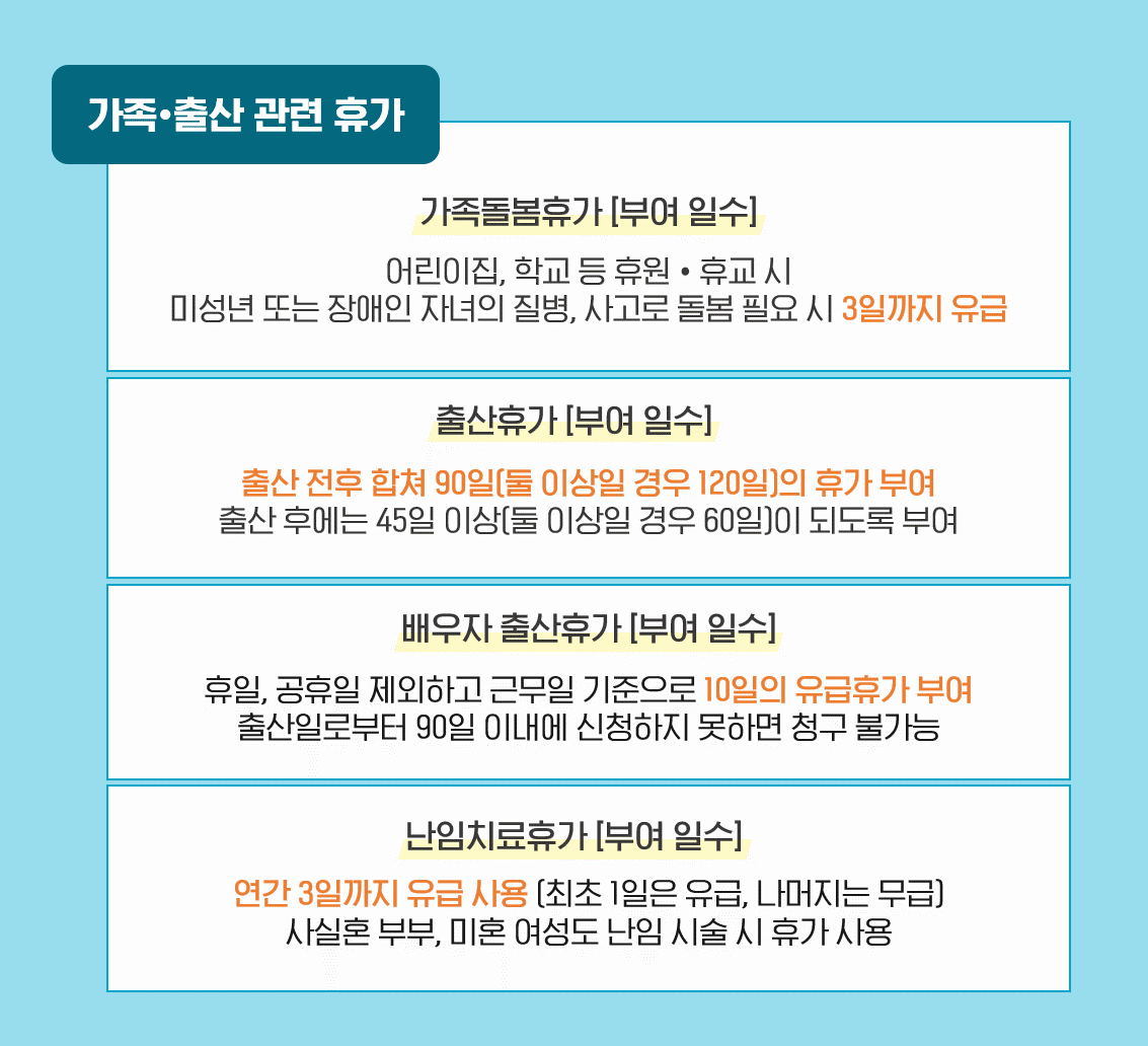 '가족돌봄휴가'는 근로자의 부모, 조부모, 배우자, 배우자의 부모, 자녀 등 긴급하게 가족을 돌봐야 할 때 사용이 가능합니다. 그리고 임신을 한 근로자를 대상으로 출산 전후에 부여하는 '출산휴가'와 배우자 출산 시 사용할 수 있는 '배우자 출산휴가'가 있습니다.