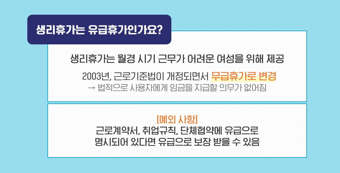 그렇다면, 많은 여성분들이 궁금해할 ‘생리휴가’는 유급휴가일까요? 정답은 유급휴가가 아닙니다. 2003년, 근로기준법이 개정되면서 유급휴가였던 ‘생리휴가’는 무급휴가로 변경되었죠. 따라서, ‘생리휴가’를 더 이상 유급으로 줄 필요가 없게 됐습니다. 단, 근로계약서, 취업규칙, 사용자와 노동조합이 체결한 단체협약 규정에 의해 ‘생리휴가’를 유급으로 지급하는 회사도 있습니다!