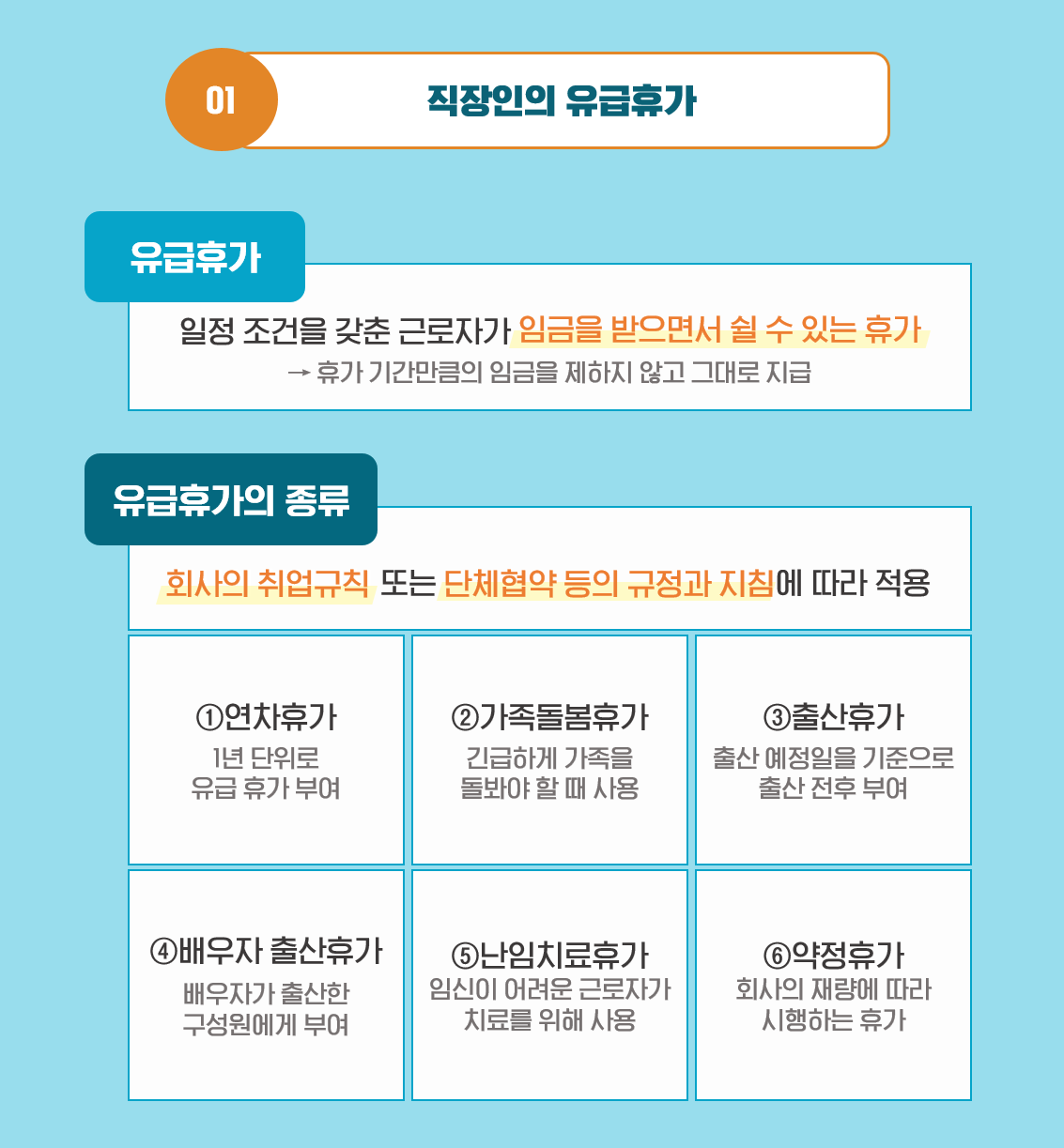 A2. 유급휴가의 부여 조건은 각 휴가마다 상이한데요. 자세한 내용은 하단의 이미지를 통해 살펴보시죠!