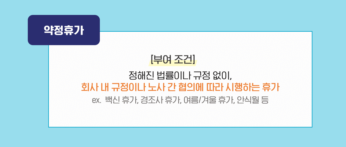 마지막으로 백신 휴가, 경조사 휴가, 여름/겨울 휴가, 안식월과 같은 ‘약정휴가’는 정해진 법률이나 규정 없이, 회사 내 규정이나 노사 간의 협의에 따라 부여받을 수 있습니다!