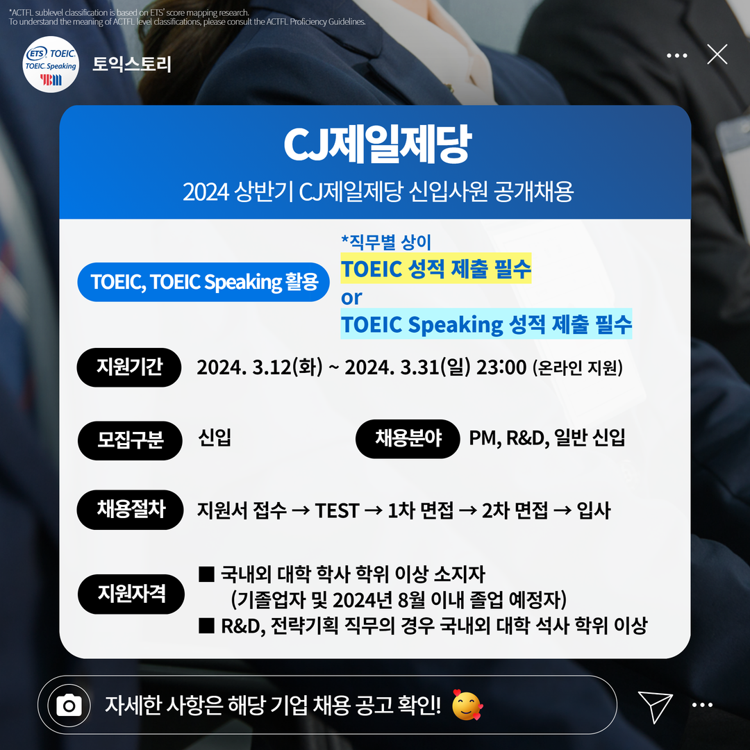 | CJ제일제당 | 신입 | 2024 상반기 신입사원 모집 | 3.31(일) 23:00 | TOEIC 성적 제출 필수 or TOEIC Speaking 성적 제출 필수 *직무별 상이 |