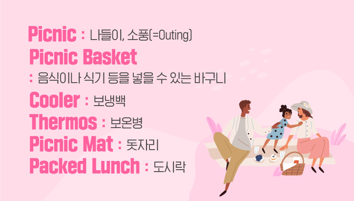 화창한 봄 날씨를 몸소 느끼기 위해서는 소풍만 한 것이 없죠! 나들이 혹은 소풍은 영어로 ‘Picnic’이라고 하며, ‘Outing’이라는 표현을 사용하기도 합니다. 이때, 두 단어가 완전히 동일한 의미를 갖는 것은 아닌데요. ‘Picnic’은 야외에서 돗자리를 펴고 소풍 바구니에 담긴 간단한 음식을 먹는 것을 뜻하고, ‘Outing’은 “밖으로 나가다”의 뉘앙스로 보통 당일치기 여행을 의미합니다.