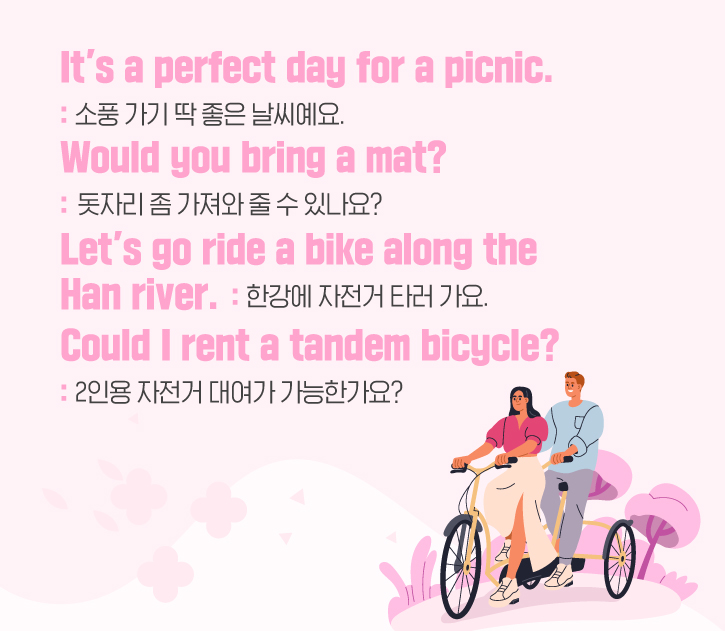 한강 공원을 산책하다 보면 2인용 자전거를 타고 데이트하는 연인들을 볼 수 있는데요. 함께 자전거를 타며 추억을 쌓고 싶다면, ‘Let's go ride a bike along the Han river(한강에 자전거 타러 가요)’라고 말해볼 수 있습니다. 자전거 대여가 필요하다면, 대여점 직원에게 다가가 ‘Could I rent a tandem bicycle?(2인용 자전거 대여가 가능한가요?)’이라고 물어보시기 바랍니다!