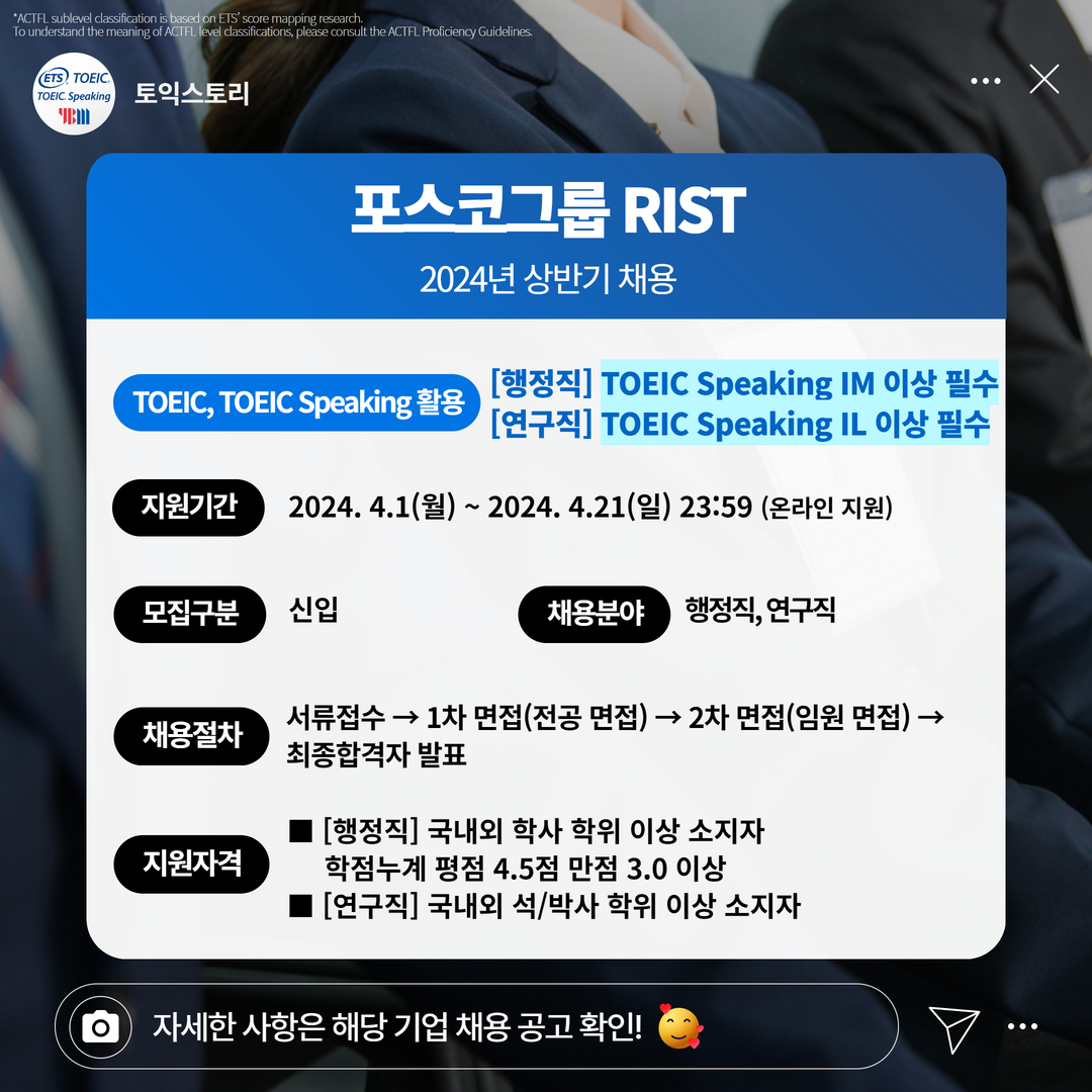 | 포스코그룹 RIST | 신입 | 2024년 상반기 행정직/연구원 채용 | 4.21(일) 23:59 | [행정직] TOEIC Speaking IM 이상 필수 [연구직] TOEIC Speaking IL 이상 필수 |