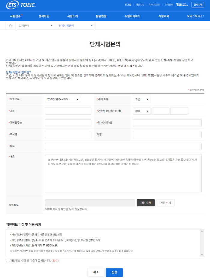 단체시험 문의하기